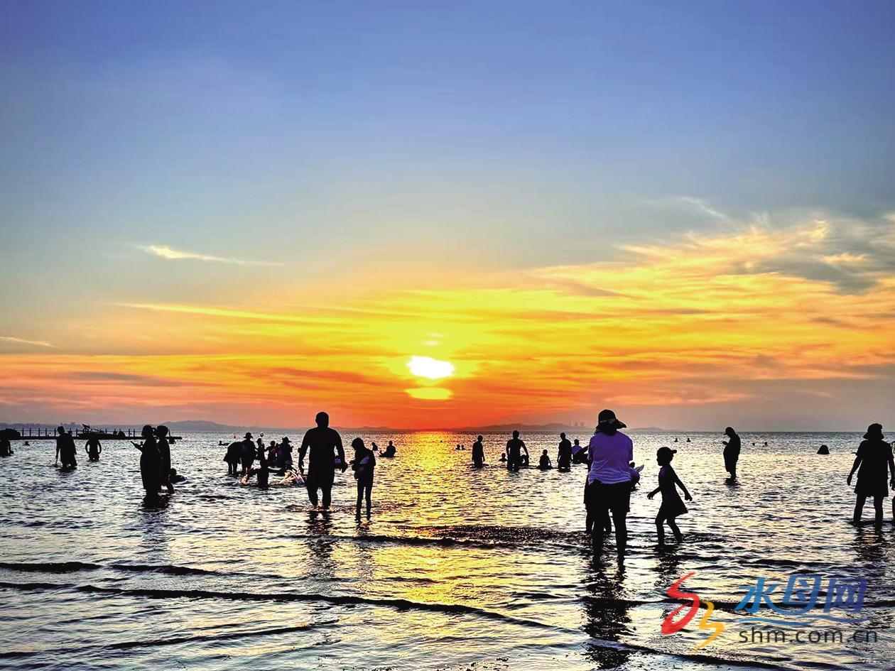 日落时分,在芝罘岛西海岸,人们在余晖里逐浪嬉戏。张国勋 摄