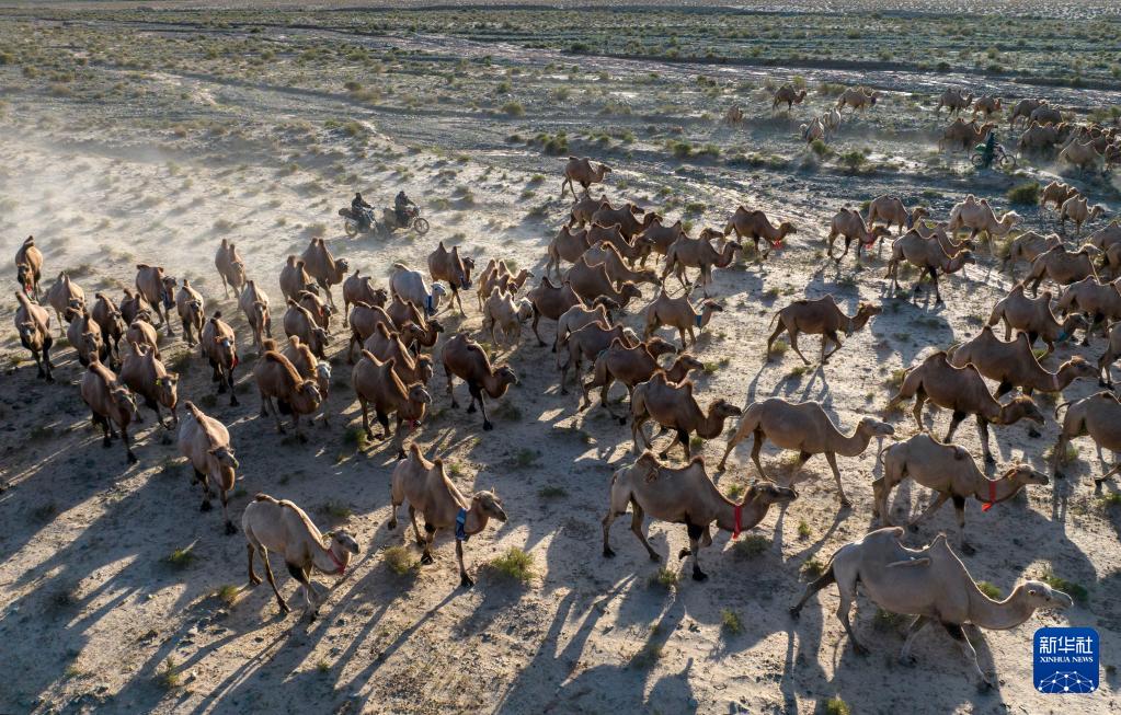 夏日里,甘肃省阿克塞哈萨克族自治县红柳湾镇加尔乌宗村牧民们赶着骆驼,从戈壁滩春季牧场转场到祁连山区的夏季牧场,让骆驼更好生长的同时也让牧场环境得到休养生息。