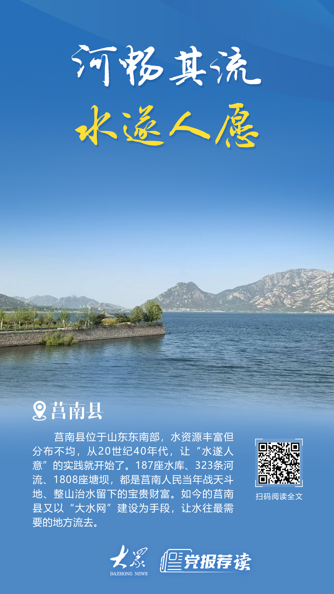 莒南县位于山东东南部,水资源丰富但分布不均,从20世纪40年代,让“水遂人意”的实践就开始了。石泉湖村缺水少粮,村民为改变困境修建了石泉湖水库,让80%的山岭地变为水浇田。厉家寨村整山治水、科学种田,毛泽东同志批示“愚公移山,改造中国,厉家寨是一个好例。”187座水库、323条河流、1808座塘坝,都是莒南人民当年战天斗地、整山治水留下的宝贵财富。如今的莒南县又以“大水网”建设为手段,让水往最需要的地方流去。