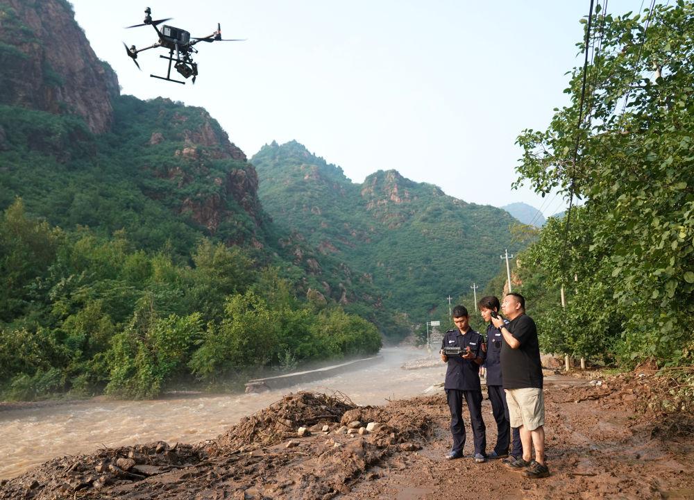 消防救援人员的无人机勘察显示,短短1公里的山区道路就存在7处水毁道路。“这条路一边靠山,一边临河,道路上满是泥沙和滚石。最初,我们一行7人组成‘突击小队’,贴着山体爬坡探路,由于草木茂盛,只能用木棍‘打草’蹚路。”平谷区应急局森林消防综合应急救援大队特勤中队班长齐欣东说。28日下午6时许,救援队成功抢通一处断路。