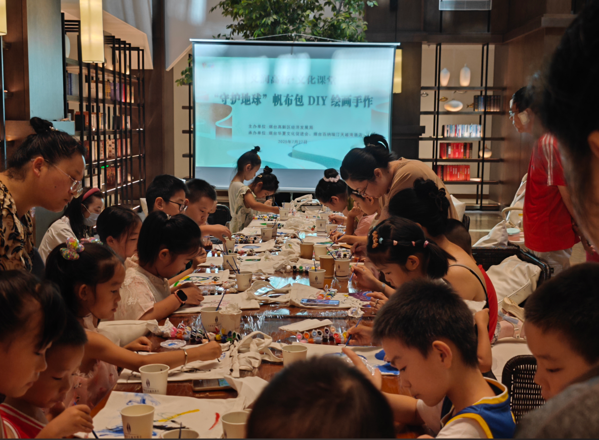 水母网讯(通讯员 修培榕)为丰富少年儿童暑期精神文化生活,打造高品质文化惠民品牌,烟台高新区经济发展局联合烟台华夏文化促进会、鲁东大学基础教育集团、烟台尼山文化传媒精心策划推出“文润高新·文化课堂”暑期儿童公益文化系列活动。7月27日,“文润高新•文化课堂”第一期——“守护地球,把环保‘袋’回家”帆布包DIY绘画活动在百纳瑞汀天越湾酒店成功举办,25组亲子家庭在寓教于乐中共享温馨创作时光。