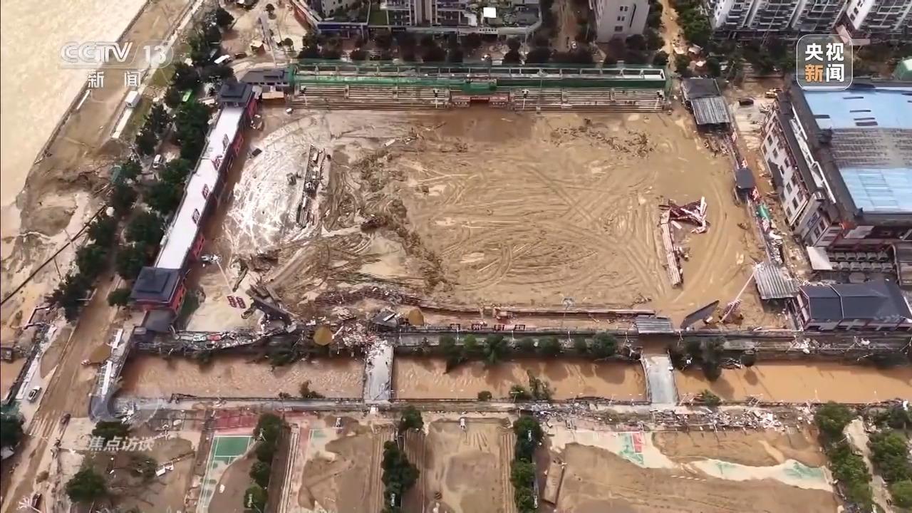 不仅有许多外地的设备来支援,也有很多来自全国各地的救援队伍一起参与到建设中。经过数天的努力,全县艰难的清淤工作终于完成,球场进入重建阶段。