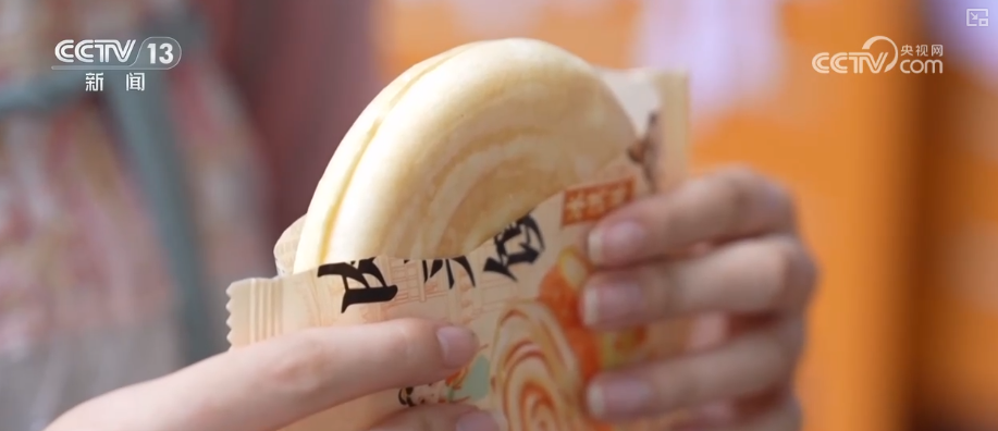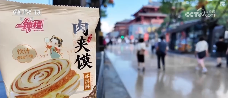 这款“冰馍馍”文创冰淇淋,外形高度还原了陕西名吃肉夹馍,内馅创新融合了咸甜口味,而包装则是本地农民画师创作的,可以说从里到外都透着浓浓的陕西味儿。在西安大唐不夜城景区,不少游客穿着古装,手拿“冰馍馍”,边吃边拍照。