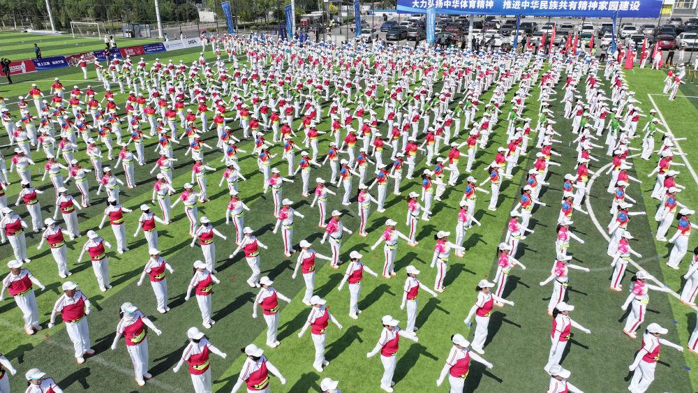 2025年6月10日,群众在宁夏银川市金凤区览山公园参加千人健身操展演(无人机照片)。当日,纪念“发展体育运动 增强人民体质”题词73周年全民健身主题活动在览山公园举行。
