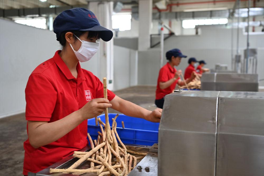 2024年7月23日,工人在甘肃定西陇西县文峰镇一家药材企业加工中药材切片。陇西中药材种植历史悠久,盛产300余种中药材,是全国“道地药材”的重要产区之一。近年来,当地通过推行产地种植标准化、药材加工精深化、原药仓储规模化、药材交易市场化、质量监测常态化、产业发展品牌化等改革创新举措,推动中医药产业高质量发展。