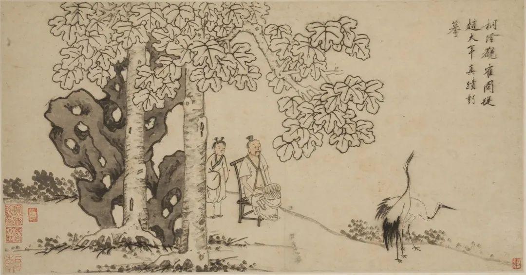 △明 沈周(款)山水人物大册(之六 桐阴观鹤),天津博物馆藏。
