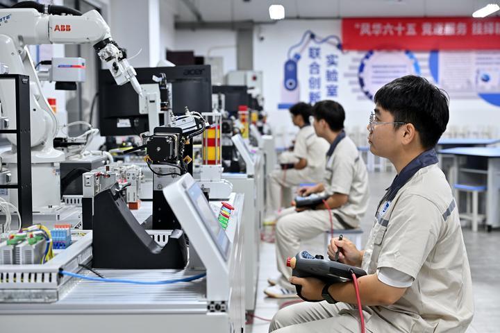 2024年7月26日,湖南铁道职业技术学院的学生在工业机器人基础应用实训室接受工业机器人操控技能训练。教育部发布的数据显示,近年来,现代制造业、战略性新兴产业和现代服务业70%以上的新增一线从业人员来自职业院校。职业院校已经成为培养大国工匠、能工巧匠、高技能人才的主阵地。