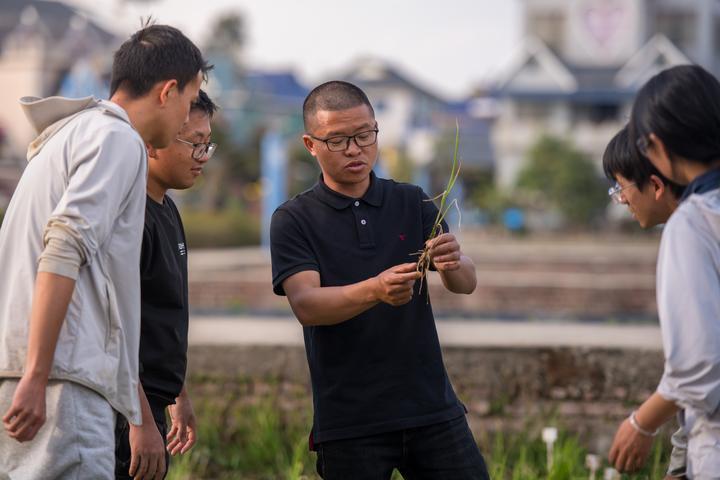 今年37岁的黄光福是云南大学农学院的一名青年教师,同时也是云南大学在云南省勐海县勐遮镇曼恩村成立的多年生稻科技小院的负责人。多年来,他带领学生扎根田间,进行技术攻关。团队利用长雄野生稻特有的地下茎无性繁殖能力,成功培育出“云大25”“云大107”等新品种,突破性地实现水稻“一次栽种、连续收割”,让“割韭菜般收稻子”的农业成果从实验室走向田间地头。这是2025年2月27日,青年教师黄光福(中)在试验田间给学生授课。