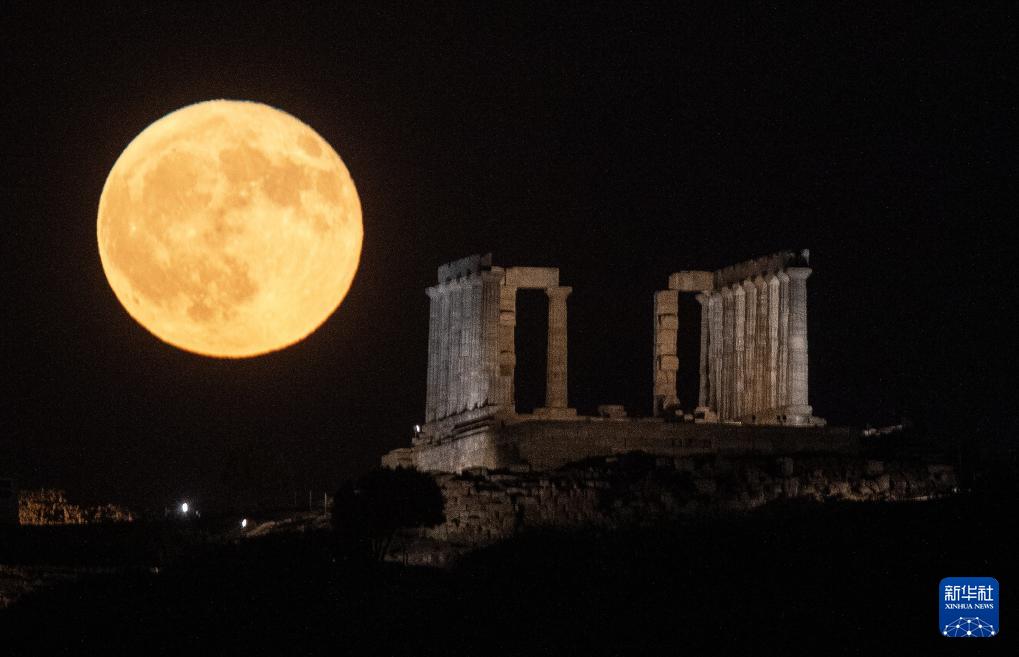 这是8月9日在希腊雅典附近苏尼翁角拍摄的波塞冬神庙和月亮。