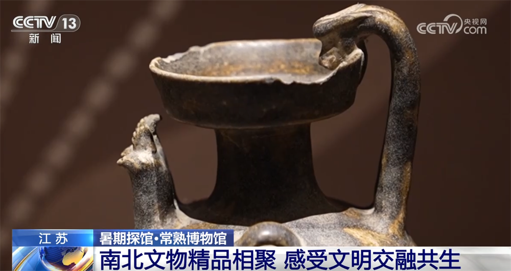 再来看这一件展品,这是东晋时期浙江德清出土的鸡首壶,一侧是有一个鸡头模样的造型,一个巴掌大小,矮胖矮胖的。再到这边来看,同样是鸡首壶,从南方地区传到北方去之后,它的造型也发生了一些变化,比如说它的个头变得更加瘦高瘦高的,而且它的执柄也明显变得更加修长,它也融入了一些异域的比如说波斯文化的元素。
