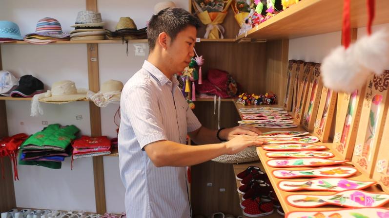 从外地返乡的“90后”扶银廷和妻子,在田铺大塆创办了一家“文创工坊”。“像鞋垫、虎头枕、虎头帽这些手工制品,都是我们当地一些老人、大姐手工做的。这些特色的文创产品既能让游客了解当地本土文化,又增加了村民收入。”扶银廷说。