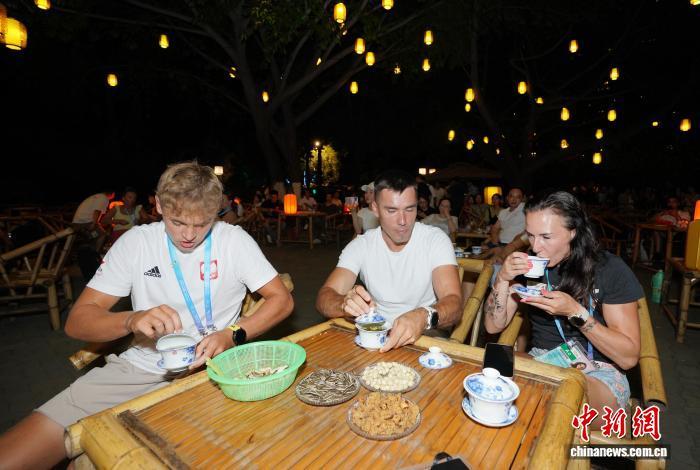 8月6日晚,成都世运会外籍运动员等在成都望江楼公园品成都盖碗茶。 中新社记者 安源 摄
