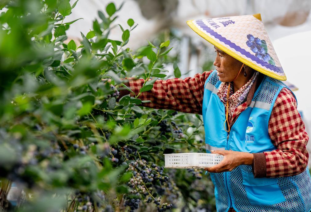 8月8日,工人在云南省兰坪县高原特色现代农业产业园采摘蓝莓。新华社记者胡超 摄