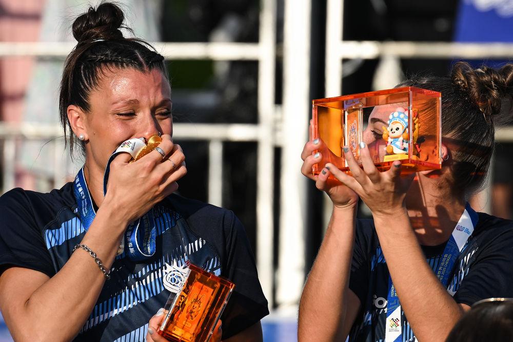 ↑8月12日,冠军阿根廷队球员在成都世运会女子沙滩手球颁奖仪式上落泪。