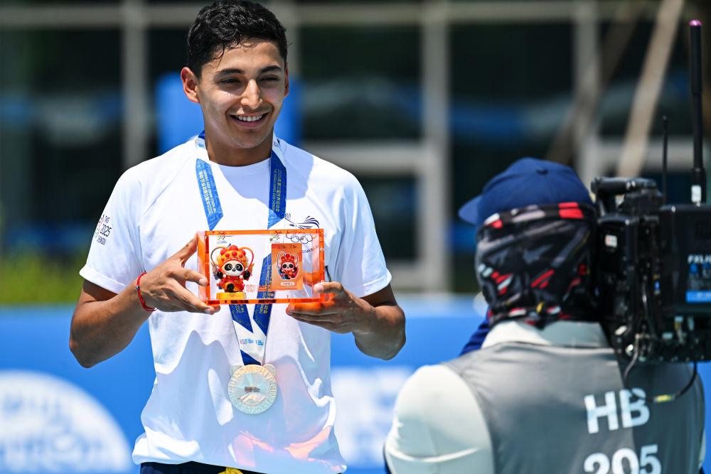 ↑8月13日,亚军厄瓜多尔队选手加西亚(左)在成都世运会速度轮滑男子公路赛(15000米淘汰)颁奖仪式上。