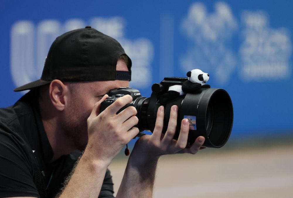↑8月13日,一名外媒记者在成都世运会软式曲棍球男子铜牌赛拍摄,他的相机镜头上装饰了熊猫玩偶。