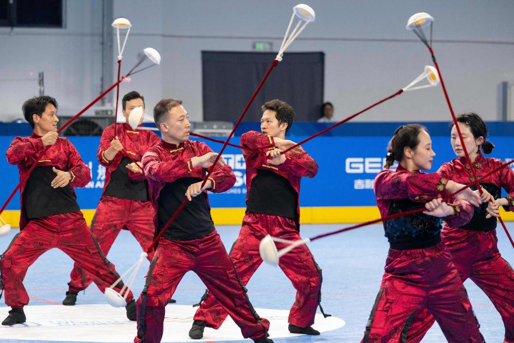 ↑这是8月6日在成都世运会软式曲棍球女子A组预赛前拍摄的步打球表演。