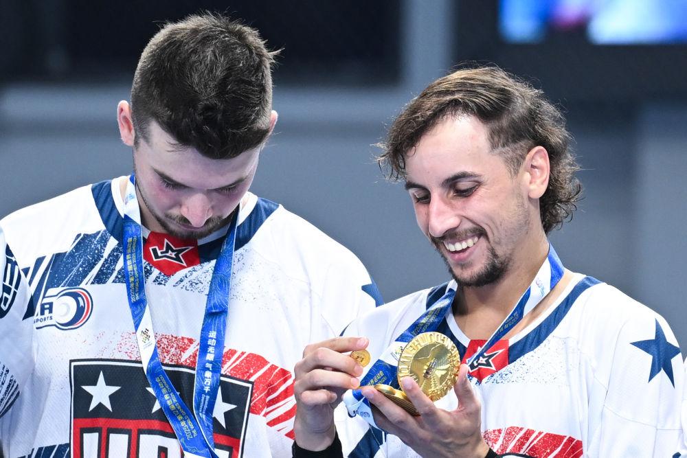 ↑8月11日,冠军美国队球员在成都世运会男子单排轮滑球颁奖仪式上查看奖牌。
