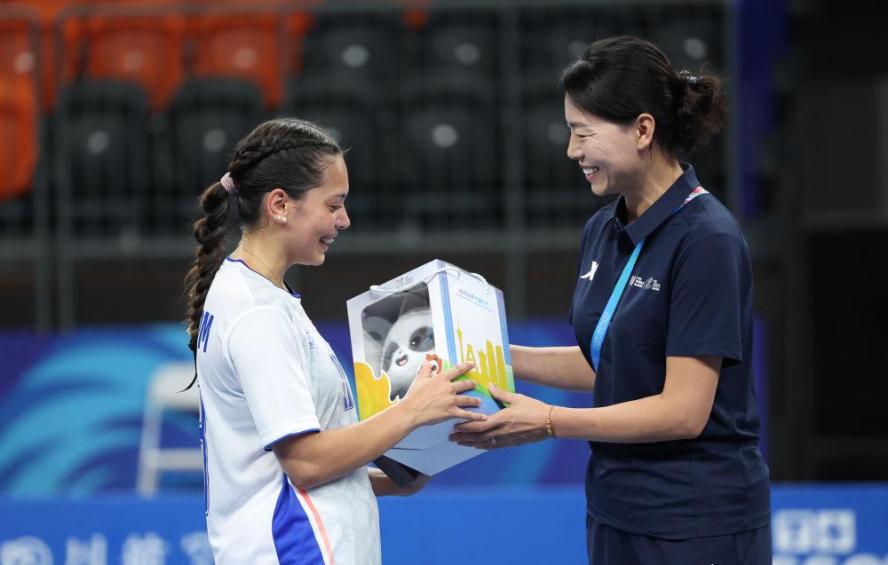 ↑8月9日,成都新都香城体育中心工作人员为当天20岁生日的泰国队球员卡尔布姆(左)送上生日礼物。