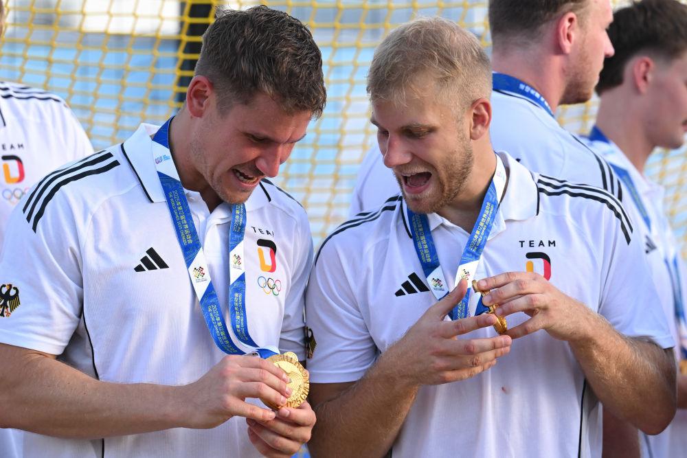 ↑8月12日,冠军德国队球员在成都世运会男子沙滩手球颁奖仪式上查看奖牌。
