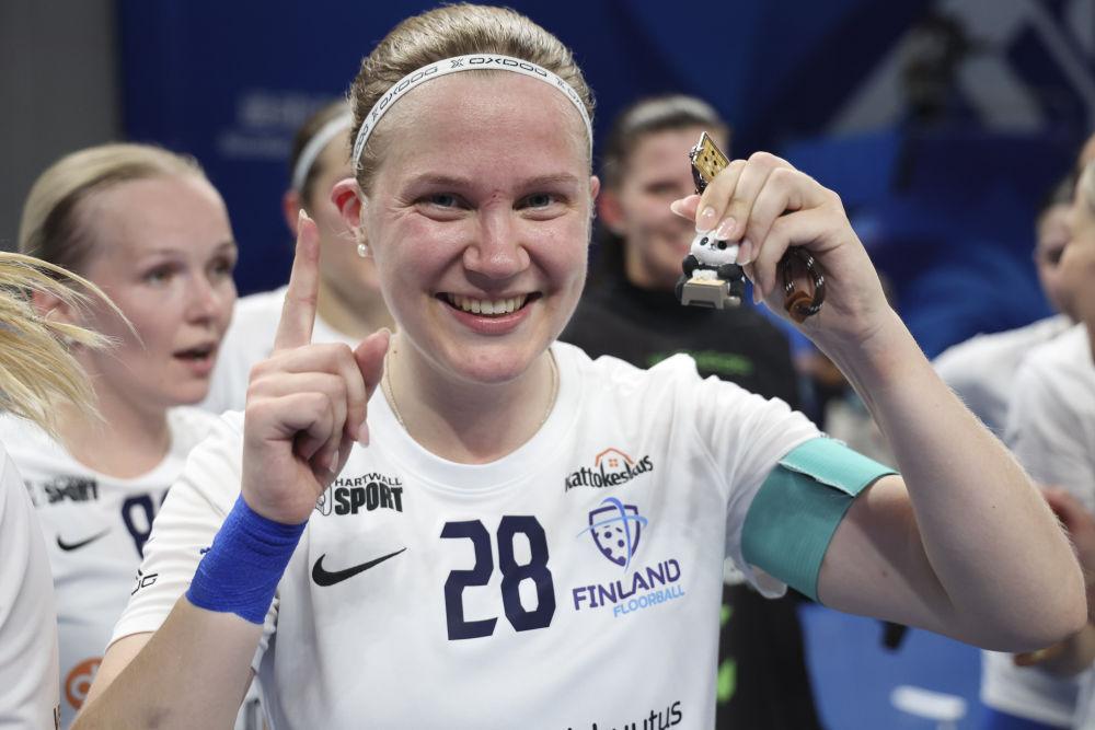 ↑8月13日,芬兰队队长薇拉·考皮(前)在成都世运会软式曲棍球女子金牌赛后展示她的“幸运熊猫”挂件。