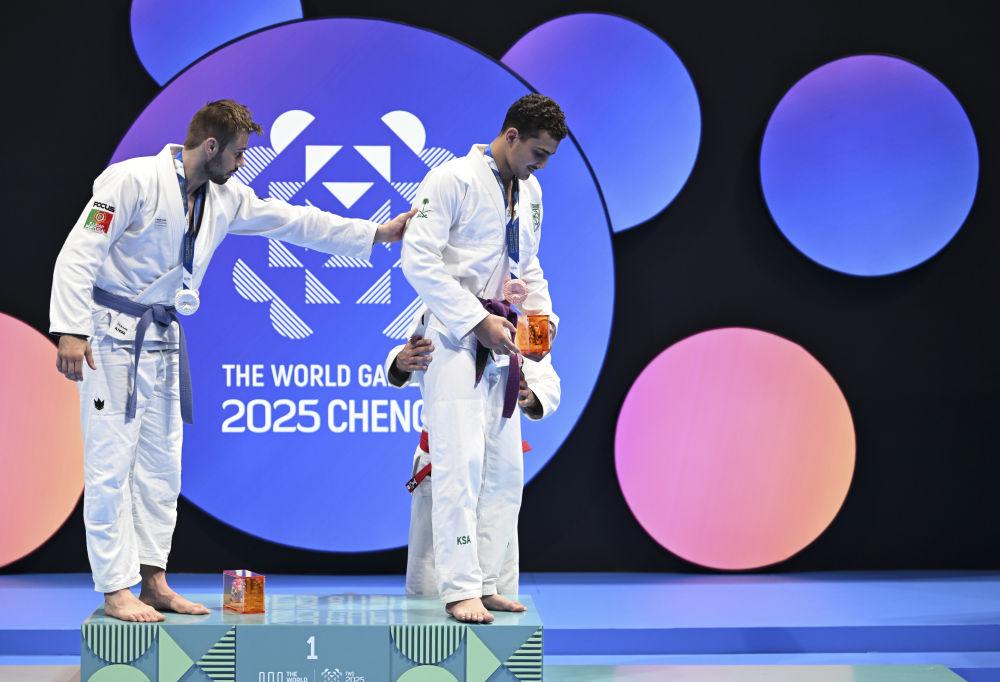 8月11日,在2025年成都世运会柔术男子寝技85公斤级颁奖仪式上,冠军阿联酋选手赛义德(后)、亚军葡萄牙选手佩德罗(左)搀扶受伤的季军沙特阿拉伯选手纳达走下领奖台。