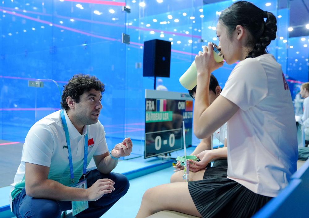 8月10日,来自埃及的中国壁球队主教练伊斯拉姆(左)在2025年成都世运会壁球女子单打遗材赛四分之一决赛间隙指导刘子仪。