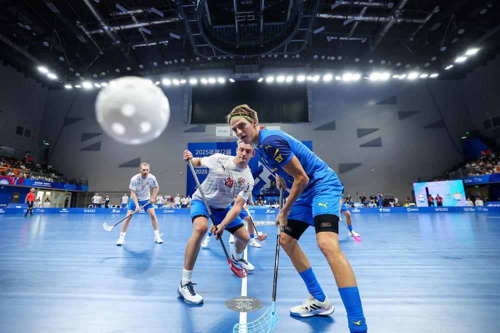 8月11日,参赛球员在2025年成都世运会软式曲棍球男子半决赛中拼抢。