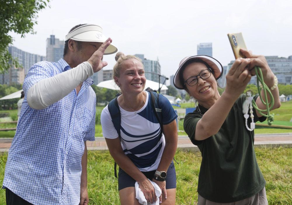 8月8日,爱沙尼亚选手克丽斯廷·莱特(中)在2025年成都世运会掷准飞盘混合双人预赛后与观众合影。