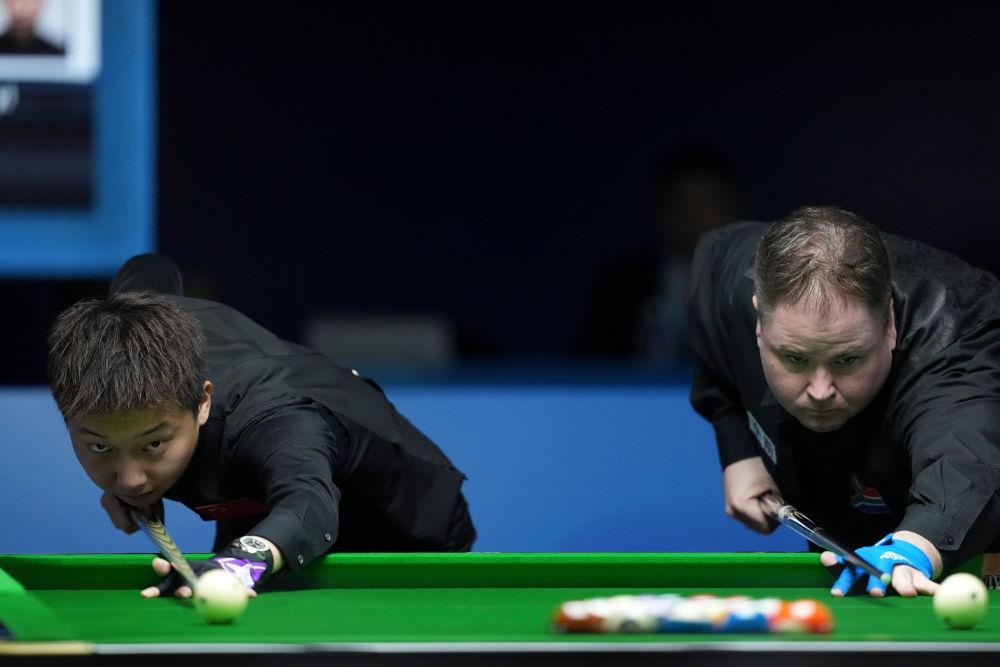 8月14日,中国选手张泰艺(左)和南非选手塞龙在2025年成都世运会台球八球混合金牌赛前开球。