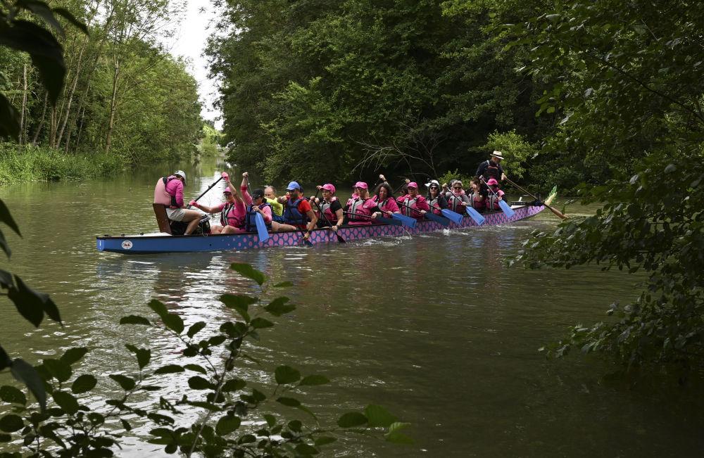 2024年7月7日,一支法国龙舟队在马恩河上划龙舟。