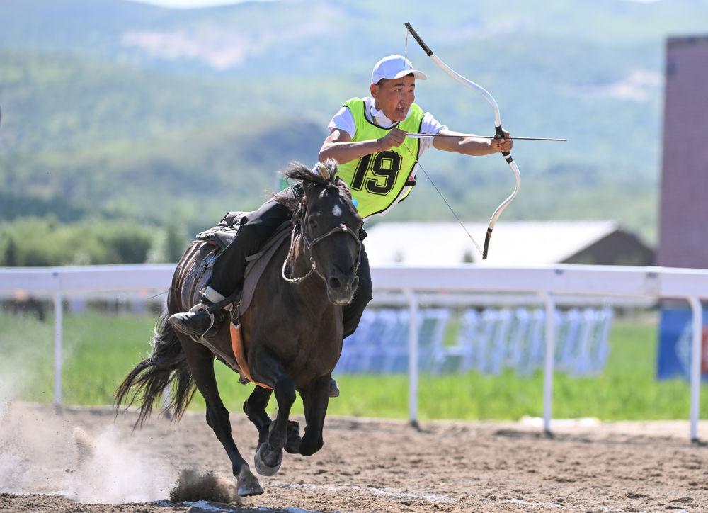 7月22日,骑手在内蒙古自治区第十一届少数民族传统体育运动会跑马射箭比赛中。