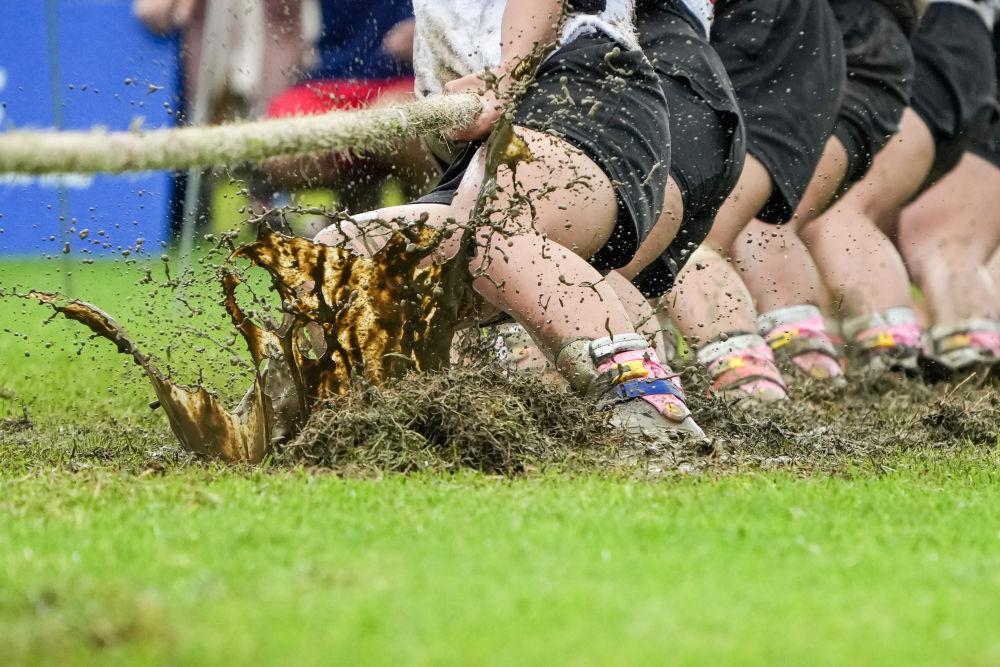 8月10日,中国台北队队员在2025年成都世运会女子室外拔河500公斤比赛中。