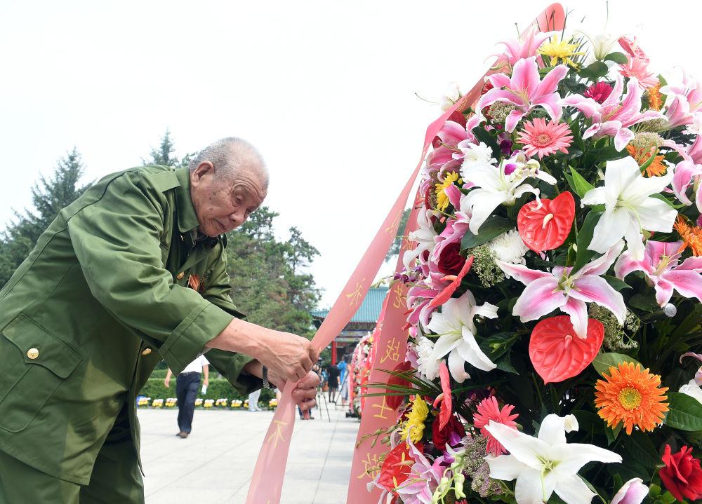 2015年8月15日,吉林省纪念东北抗联精神大会在吉林通化举行,各界群众来到通化市杨靖宇烈士陵园,缅怀牺牲的东北抗联将士。这是一位东北抗联老战士为烈士敬献花圈。
