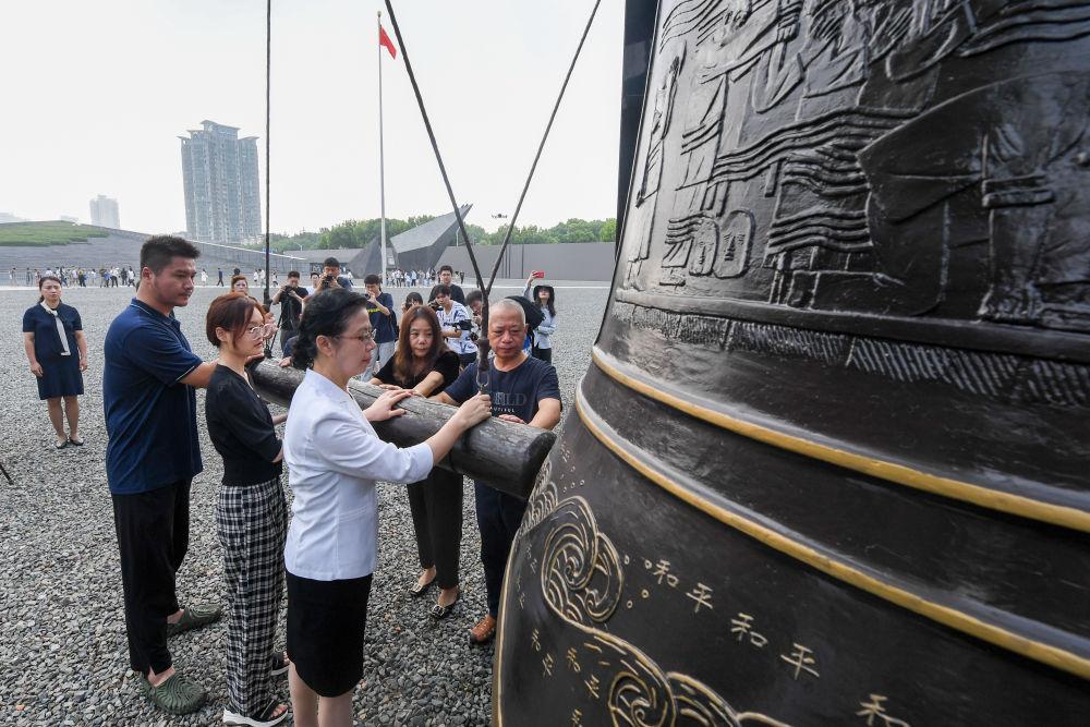 2023年8月15日,南京大屠杀幸存者后代代表在侵华日军南京大屠杀遇难同胞纪念馆公祭广场撞响和平大钟,祈福和平。