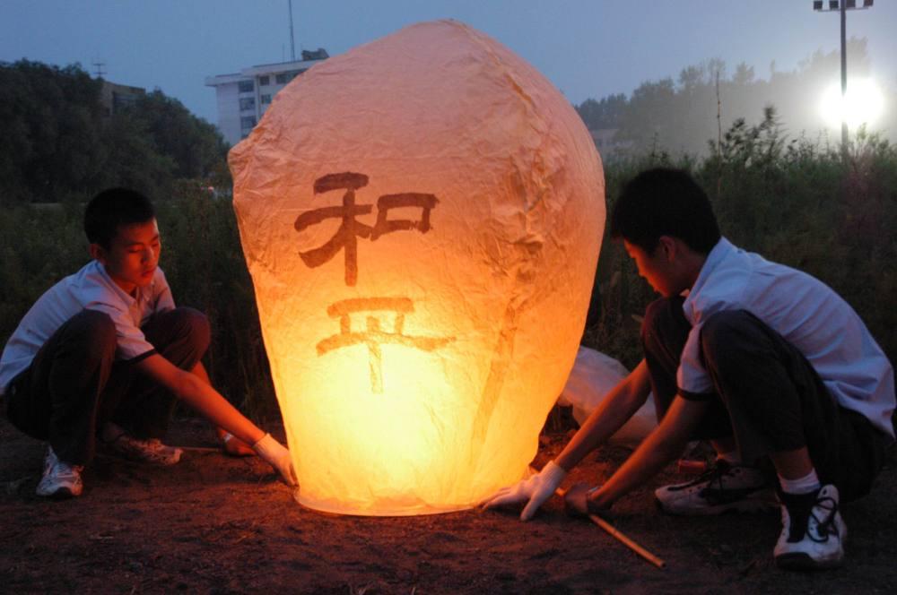 2005年8月15日,近万名各界群众聚集在哈尔滨市平房区侵华日军第七三一部队罪证陈列馆,举行祈祷和平活动。这是市民点燃孔明灯。