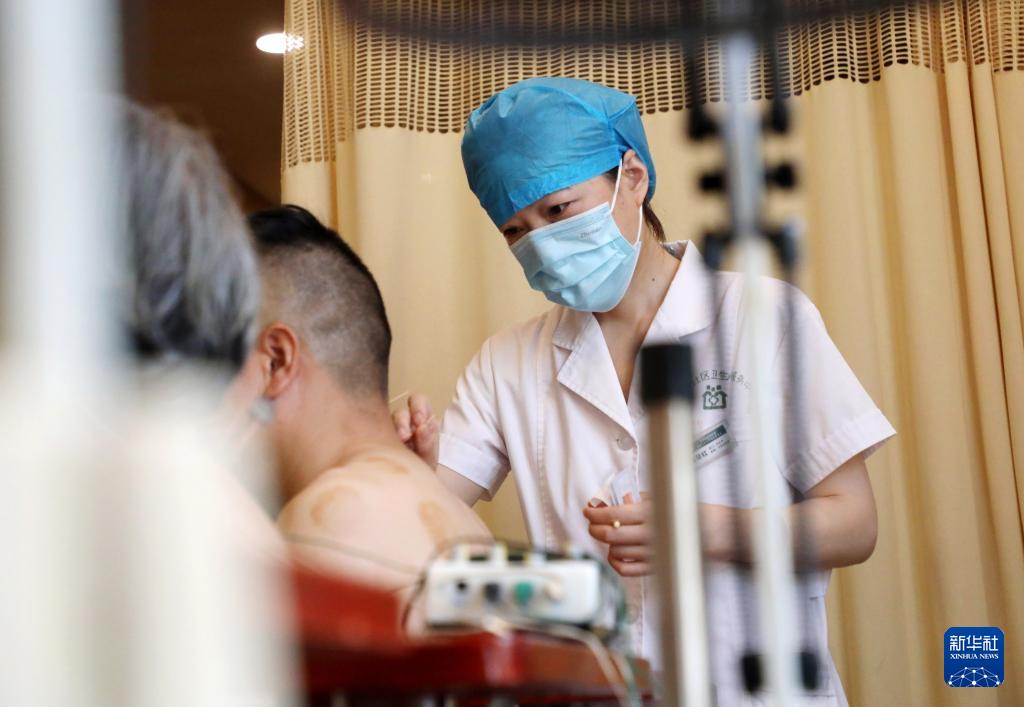 8月18日,江苏省苏州市姑苏区金阊街道彩香二村社区卫生服务站医生为居民进行针灸诊疗。