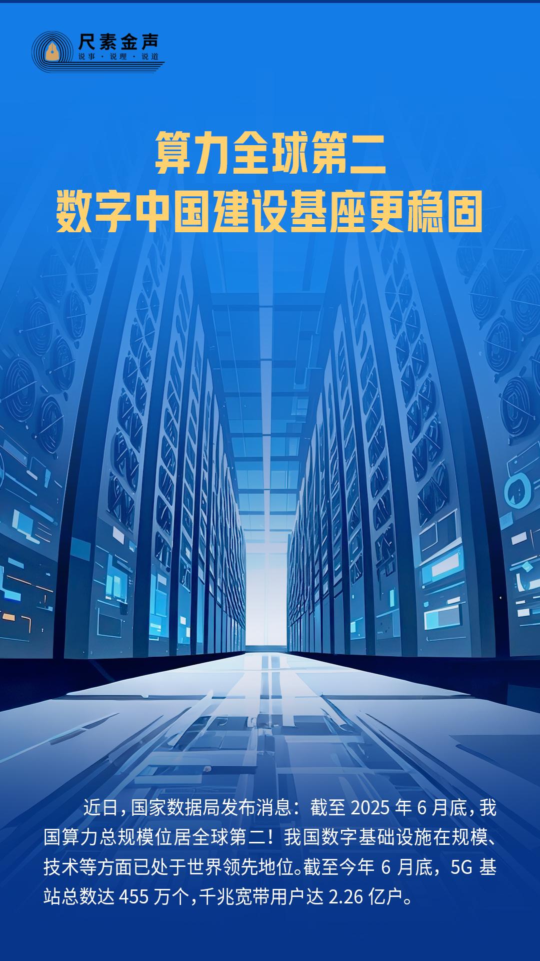 近日,国家数据局发布消息:截至2025年6月底,我国算力总规模位居全球第二!我国数字基础设施在规模、技术等方面已处于世界领先地位。截至今年6月底,5G基站总数达455万个,千兆宽带用户达2.26亿户。