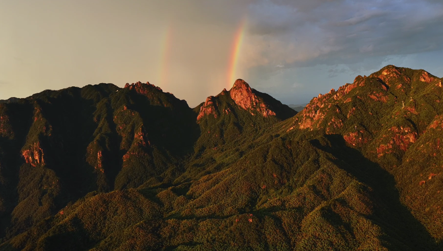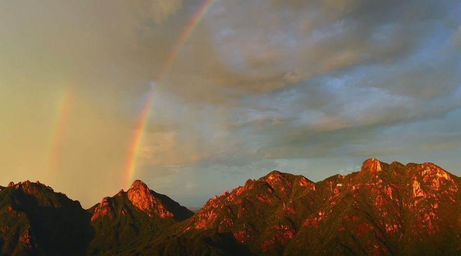 8月21日,安徽省九华山风景区雨后出现壮美的“双彩虹”景观,宛如彩带横跨天空,梦幻又美好。(饶治国、杨银龙、叶志)