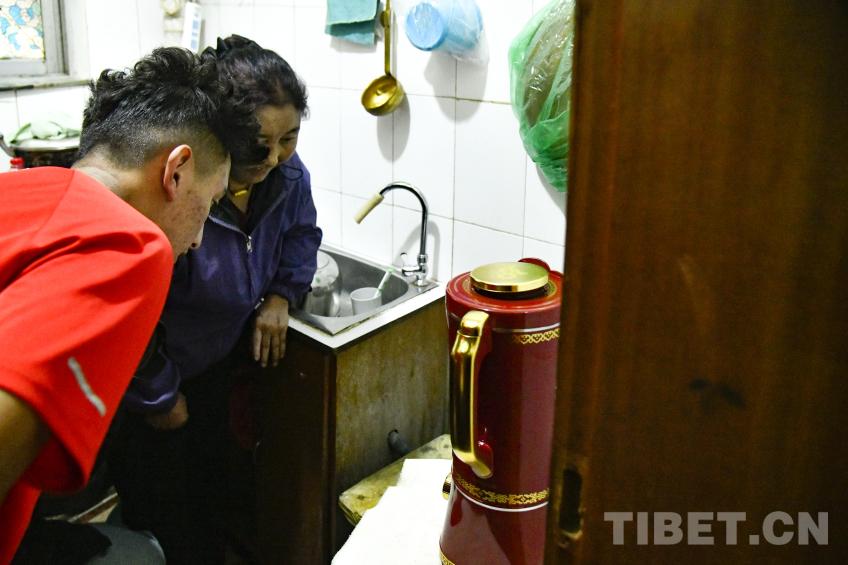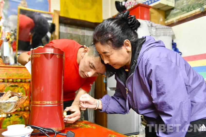 图为卓嘎与儿子罗布次仁一起仔细研究这一台全自动酥油茶壶的使用 摄影:赵振宇