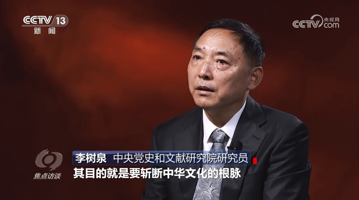 中央党史和文献研究院研究员李树泉:“文化侵略是日本帝国主义侵略中国的重要组成部分,为达到彻底灭亡中国的目的,在文化上进行了一系列有预谋的破坏,其目的就是要斩断中华文化的根脉,达到彻底把中国殖民化的目的。”