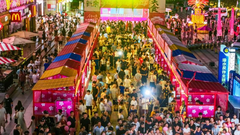 步入流光溢彩的消费市集,这里有非遗区、农特文创区、美食区等多个板块,商家们在这里充分展示本地特色产品、文旅资源与七夕文化元素,此起彼伏的叫卖声与美食香味交织。市集旁七夕情歌大舞台传来的动人歌声,勾勒出一幅充满烟火气的夏夜景象。作为消费月活动亮点,花车巡游每周五、周六下午5时30分准时启程,从恒太城出发,途经赣西民宿风情街,抵达抱石公园。每到一站,“七仙女”翩然降临,带来精彩快闪舞蹈,并向观众派发文创小礼品,引发阵阵热潮。风情街的王老板笑逐颜开:“(有花车巡游时)人流量是平时的三倍!感谢‘仙女’们给我带一波流量!”截至8月27日,七夕消费月带动参与商户总支付2559.22万元,带动参与商户总核销1656.67万元,生动体现了“浪漫经济”的强劲发展动能。