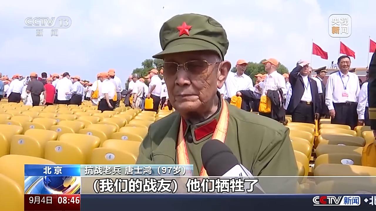 抗战老兵 唐士鸿:我们的战友他们牺牲了,没有看到今天的胜利。现在中国人民解放军能够战胜一切的敌人,叫战友在地下安息。前一代人故去了,下一代或者多代要把接力棒接下来继续战斗。不要战争,不要打仗,要过和平的生活。