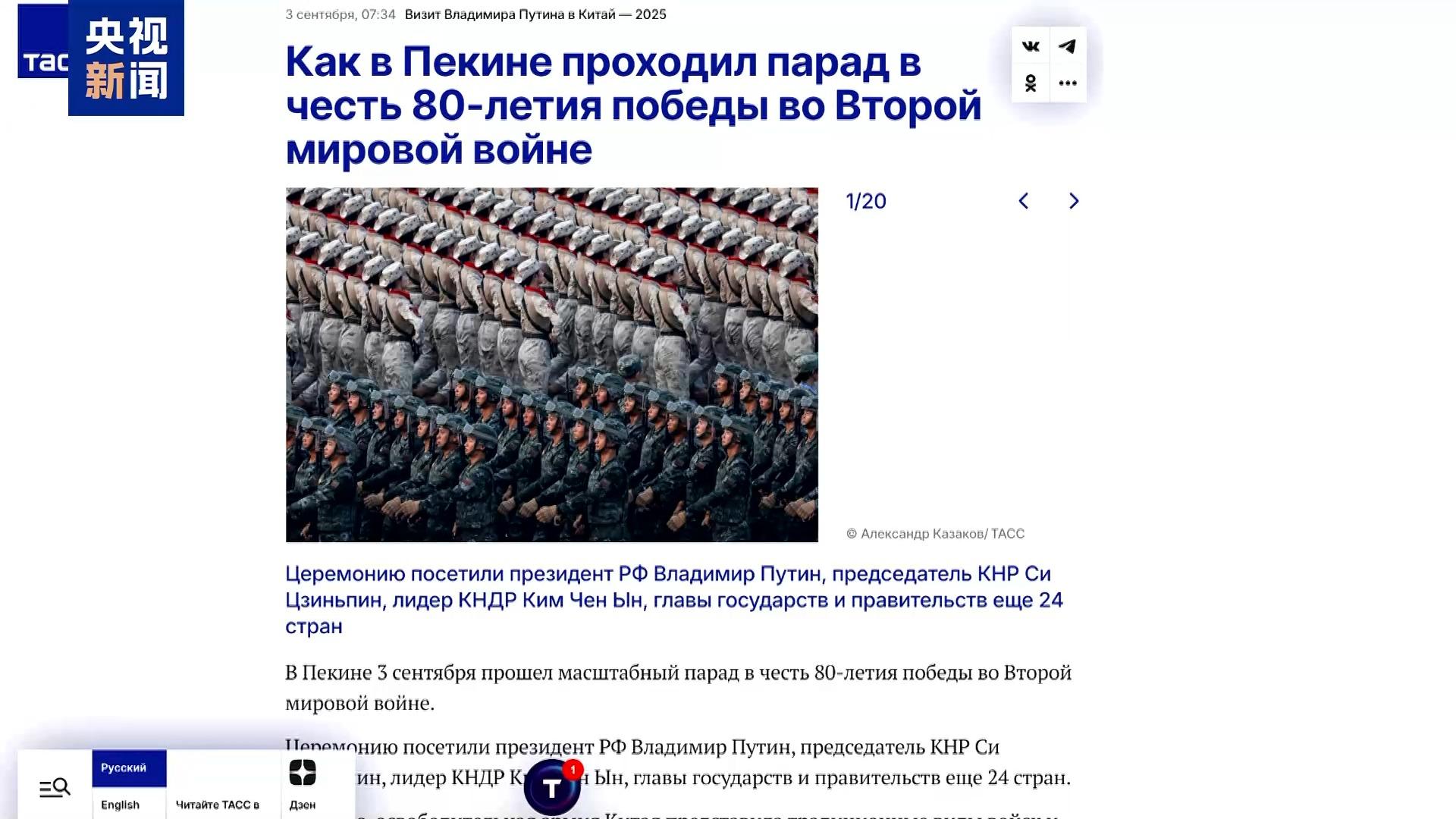 俄罗斯1频道 主持人:为了纪念战胜日本军国主义和二战结束80周年,北京举行了宏大的阅兵仪式,普京作为主宾参加。阅兵仪式上,中国首次展示了新一代“三位一体”核打击能力以及多种让世界惊叹的新式武器。阅兵仪式不仅向世界展示了中国的军事实力,同时也是一场视觉盛宴。阅兵仪式上还放飞了8万只鸽子和8万只气球。