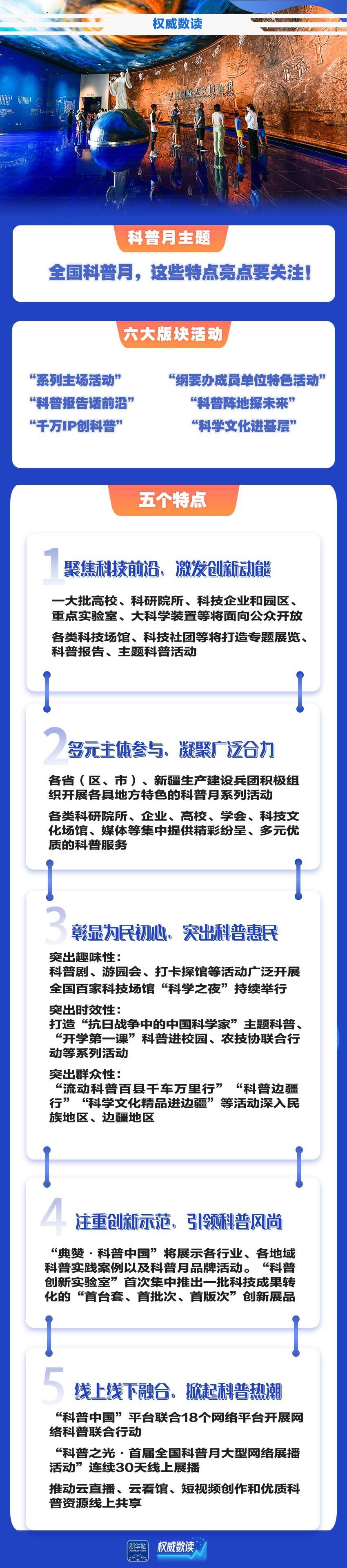 国新办4日举行发布会,介绍首个全国科普月活动有关情况。此次活动由中国科协联合全民科学素质纲要实施工作办公室成员单位共同部署开展,设置六大版块活动,旨在打造全领域行动、全地域覆盖、全媒体传播、全民参与共享的科普盛宴。全国科普月活动有何亮点、特点?点开海报,一起看看吧。
