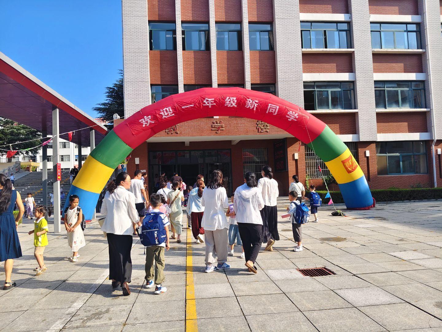 清晨,校园门口便热闹起来。色彩斑斓的充气拱门矗立在教学楼前,“欢迎一年级新同学”的字样格外醒目。一年级的小萌新们在家长的陪伴下,好奇地打量着校园,眼神中满是对新环境的期待。其他年级的同学们也背着书包,兴高采烈地走进校园,许久未见的伙伴们相互热情问候,分享着假期的趣事,校园道路上“校园焕新待学子,新学期里展风姿!”的横幅,也为这开学的喜悦氛围更添一抹亮色。