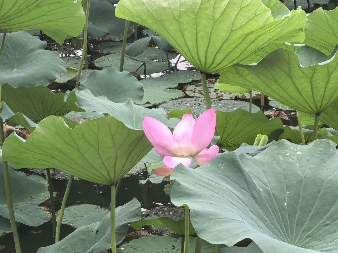 我去的那天,已经过了荷花的盛放期了。不少荷叶的中间没有蒸发的雨珠圆嘟嘟地在荷叶中间滚动着,玲珑剔透。有的荷花的茎上已经生出了圆圆的莲蓬。“七月芙蕖正烂开,无限香从水面来”,从身边经过的那些游人有的把手机镜头对准了水里的莲蓬,有的在田田的荷叶中间找寻着还在开着的荷花。明湖的水面浩大,但那样一片汪汪的荷叶从湖岸延展开去,在水面上还是廓成了很有气势的样子。一位正在值勤的人员告诉我,曾堤北侧还有很多荷花正开着。我顺着他手指的方向望过去,正有不少的人向着曾堤行进着。粉红的荷花从曾堤边一直开到水的深处和远处,近看是一朵一朵,远看是一片芬芳。