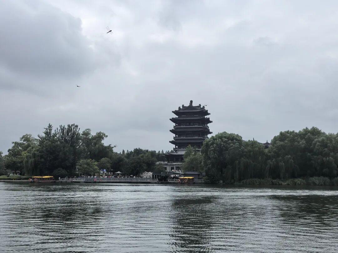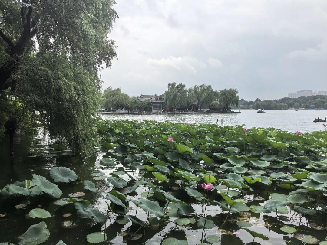 昨夜雨急风骤。雨后的天空很淡净,灰白相间的云朵在半空垂着,像天空那些流浪的栖居者一样,等待着一阵风把它们吹向自己远处的家。雄踞的超然楼落在小东湖和明湖,气宇轩昂。从小东湖的东岸能很清晰地看到楼前人头攒动,楼上各层也有不少的人正向湖中张望着。北渚桥和鹊华桥一北一南,串联着明湖和小东湖,隔岸夹树,不过几百米,有画舫不停地来回穿行过,绕着小东湖过去,移步换景之间,还得需要一段时间,正好可以在湖光山影中仔细捋一捋心中不断浮现的那些翠竹与荷花。虽然久居泉城,要在一时之间把大美济南的竹韵荷风捋成一幅山水画卷,还真得下一番功夫。想着刚才护城河边的那些细丝的垂柳,在这云淡风轻的天光里,还真有“剪不断理还乱”的感觉。