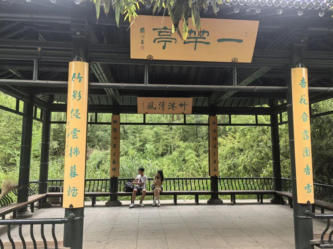 “水能性淡为吾友,竹解心虚助我师。”北边是超然楼,南边是鹊华烟雨,中间的竹港清风好像真的成了穿篱绕舍,翠碧幽深之处了。其实那种静在几步之远的喧嚣之外是竹影清风,清净无尘。是你走乏了,心累了,正想觅一处闲静去处,做一些思念和怀想,竹港清风就在冥冥之中等着你了。所以,我每次到明湖都要到竹港清风小坐。那天的竹港清风很清静,“一竿亭”和亭子的几根柱子好像刚用黄色的漆刷过不久。从远处就能清晰地看到“一竿亭”下面的廊柱上画面感很强的“杏花含露团香雪,竹影侵云拂暮烟”闪烁着云天之间投过来的光影。竹港清风的北面就是超然楼,南面隔着一脉水带就是鹊华桥和明湖路,茂盛的竹林隔绝了外面的喧闹,实在是适宜休憩之地。有一对年轻的情侣在亭子里面的长廊上坐着,相互依偎着。听他们的口音像是外地人,那一刻,那个地方是属于他们二人你爱谈天我爱笑的甜蜜空间。我也曾有过,所以没有打扰,把那个片刻和美好空间留给了幸福温馨的他们。