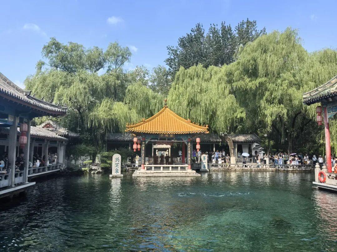 靠近明湖南门不远处,是正在盛放的很大一片荷花,与水中的历下亭连接了起来。从百花洲租了汉服的女孩子在水岸边摆出各种各样的姿势,寻找着与水中开放的荷花共舞共情的最佳造型。想想也是,不是每天都能与这些美丽的荷花邂逅相遇,有的还是行走了千山万水,想把一份弥久的深情长留在明湖畔和荷花丛,所以那么多的年轻人在湖畔留影留痕,就不足为奇了。历下亭的那些游人向着岸上的人们挥着手,分享着独坐亭上欣赏的一湖风光。岸上的人们心情急迫了,就排了长长的队伍,等待着检过票,乘了美丽的画舫,穿行在竹韵荷风中,与大美济南的山泉湖巷共赴一场秋水长天的时光和风光之约。有的年轻人则选择了去约会不远处的夏雨荷。那个美丽的少女,端坐在湖岸丛林中,向着明湖路和对面百花洲的行人不停地眨着眼睛。背后的明湖里波动和流传着她的传说和趣事。从竹林荷花中穿行出来,在明湖畔偶遇雨荷,倘若能够读懂她眼中顾盼的神采,你不由自主就穿越时空,回到那“藕欲作舟花作屋,更和风露管清秋”的场景中了,是古是今,全在你的心境了。